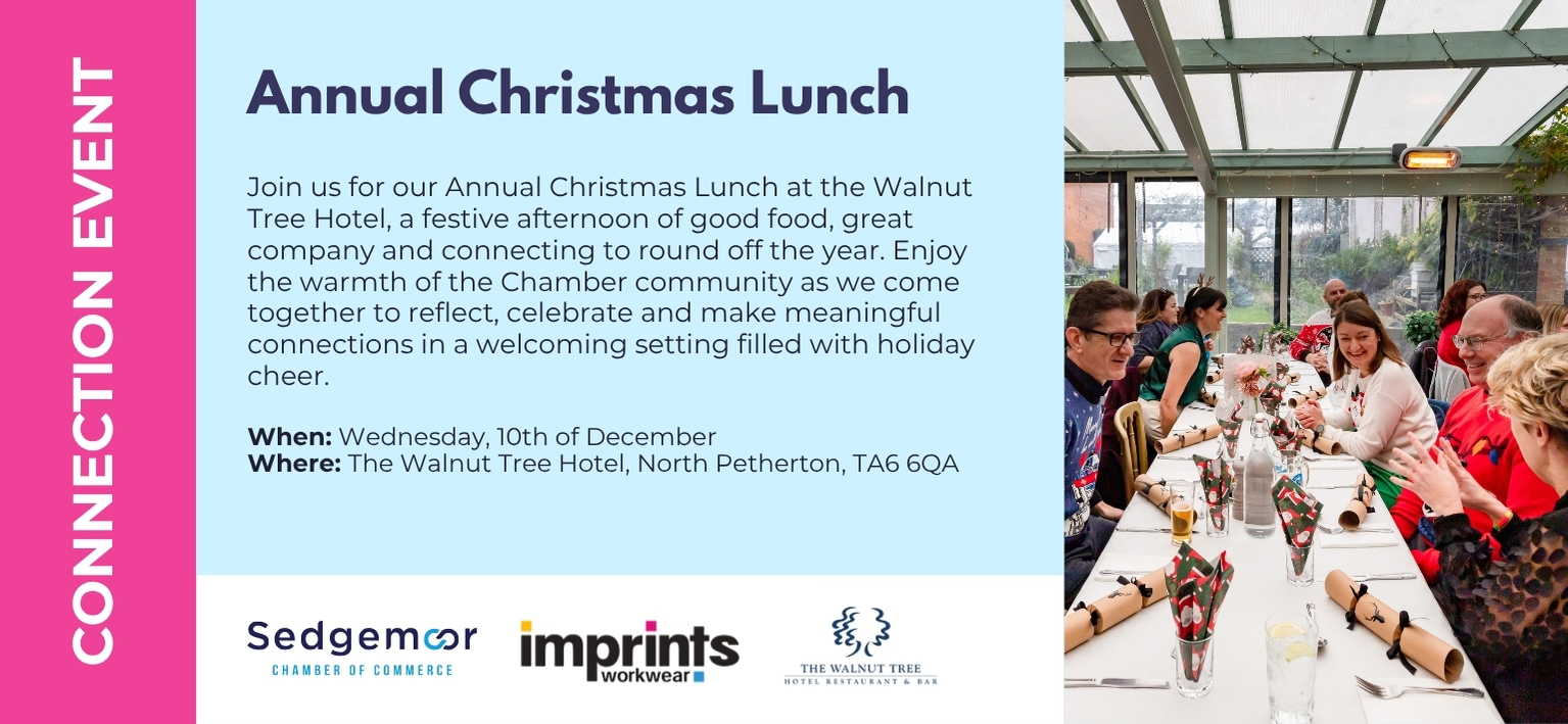Celebrate the season with us at our Annual Christmas Lunch, this year held at the Walnut Tree Hotel in North Petherton. It is the perfect opportunity to take a well-earned break, enjoy a delicious festive lunch, and reconnect with fellow Chamber members as we round off another successful year. Whether you are celebrating your own […]